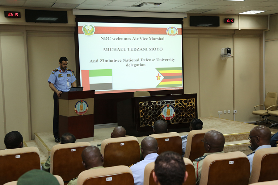 NDC received a delegation headed by the President of the Zimbabwean National Defence University on Sunday 2 July 2017. The purpose of the visit was to exchange ideas regarding issues at the regional and international. The delegation was received by Major General Staff Pilot Rashad Mohamed Alsaadi, Commandant of the UAE NDC College. The delegation was briefed about the college and its academic programs. The visit was closed by photo taking.